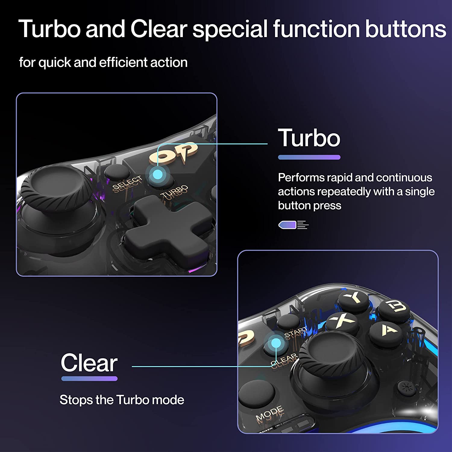 - Special Function Buttons: The Turbo and Clear special function buttons of the controller enhance the gaming experience by allowing the user to perform actions quickly and efficiently.